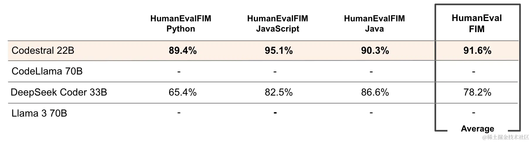 - 代码补全 ( FIM ): Codestral-22B 在代码片段中间有缺失的情况下能够成功地进行补全。在 Python、JavaScript 和 Java 中,Codestral-22B 都取得了接近或超过 90% 的 HumanEvalFIM 评分,平均成绩为 91.6%,超过了参数量更大的 DeepSeek Coder 33B。