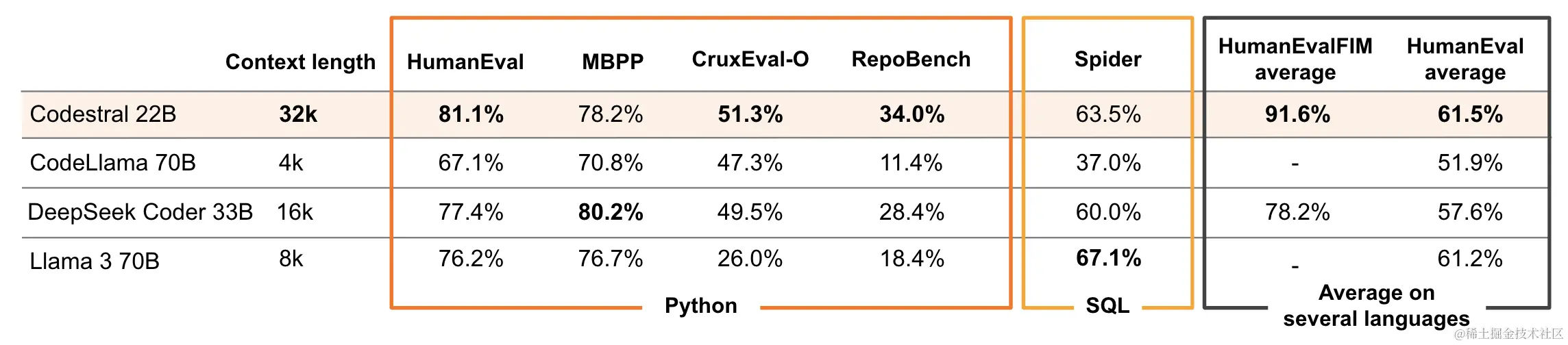 - SQL 代码生成: 在针对 SQL 的 Spider 测试中,Codestral-22B 的表现也与通用模型 Llama3 十分接近。