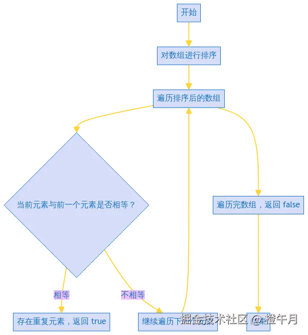 - 遍历排序后的数组,检查相邻元素是否相等。