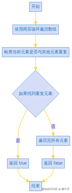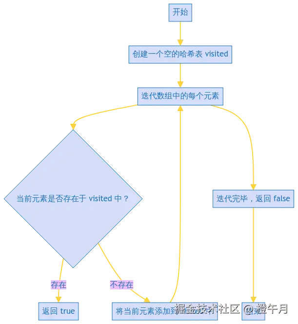 true。 - 如果遍历完整个数组都没有找到重复元素,则返回