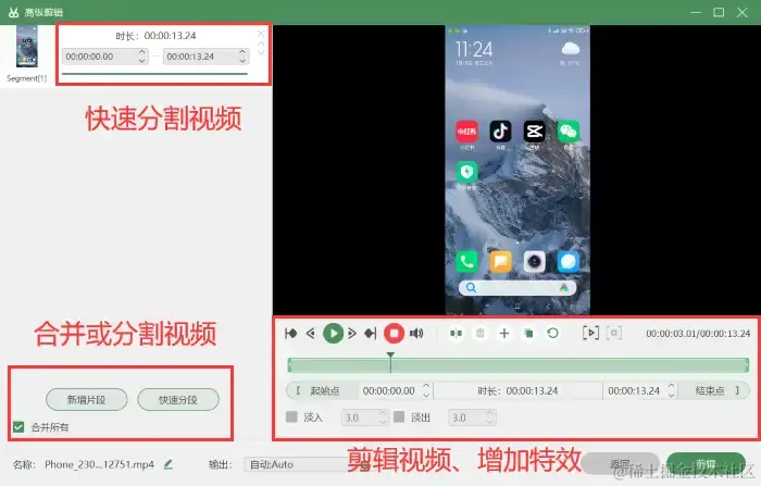 步骤5:录制结束后,会自动弹出视频预览,点击 【高级剪辑】 按钮进入可以对录制的手机视频进行剪辑。