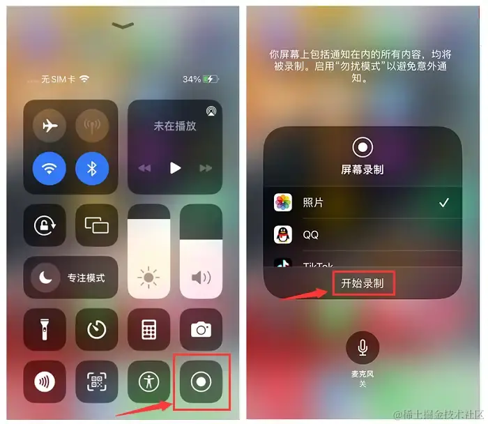 步骤2:在控制中心中,找到一个圆形按钮。长按这个圆形按钮,即可进入录制。
