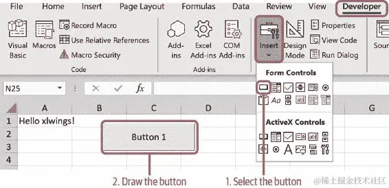 由于在 VBA 中写多行字符串并不好玩,我们使用了 Python 接受的分号而不是换行符。你可以有几种方式运行这段代码:例如,在 VBA 编辑器中时,将光标放在SampleCall宏的任一行上,然后按 F5。通常情况下,你会从 Excel 工作表而不是 VBA 编辑器运行代码。因此,关闭 VBA 编辑器并切换回工作簿。在 Windows 上,键入 Alt+F8 或 macOS 上的 Option-F8 将显示宏菜单:选择SampleCall并点击运行按钮。或者,为了使其更加用户友好,在你的 Excel 工作簿中添加一个按钮并将其与SampleCall连接起来:首先确保在功能区中显示了开发人员选项卡。如果没有显示,请转到文件 > 选项 > 自定义功能区并激活开发人员旁边的复选框(在 macOS 上,你可以在 Excel > 首选项 > 功能区和工具栏下找到它)。要插入按钮,请转到开发人员选项卡,在控件组中点击插入 > 按钮(在表单控件下)。在 macOS 上,你将直接看到按钮,无需先进入插入选项。当你点击按钮图标时,你的光标会变成一个小十字:使用它通过按住左键并绘制一个矩形形状在你的工作表上绘制一个按钮。一旦释放鼠标按钮,你将看到分配宏菜单——选择SampleCall并点击确定。点击你刚刚创建的按钮(在我的情况下是“Button 1”),它将再次运行我们的main函数,就像在图 10-3 中一样。