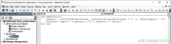RunPython接受一个包含 Python 代码的字符串:通常情况下,你会导入一个 Python 模块并运行其中的一个函数。当你通过 Alt+F11(Windows)或 Option-F11(macOS)打开 VBA 编辑器时,你会看到quickstart命令在名为“Module1”的 VBA 模块中添加了一个名为SampleCall的宏(参见 Figure 10-2)。如果你看不到SampleCall,请在左侧的 VBA 项目树中双击 Module1。