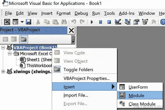 添加 VBA 模块;要添加 VBA 模块,请通过 Alt+F11(Windows)或 Option-F11(macOS)打开 VBA 编辑器,并确保在左侧树视图中选择工作簿的 VBAProject,然后右键单击它,选择“插入” > “模块”,如图 10-5 所示。这将插入一个空的 VBA 模块,您可以在其中编写带有