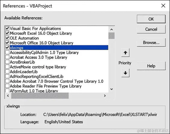 RunPython是 xlwings 插件的一部分。要使用它,您需要确保在您的 VBA 项目中设置了对xlwings的引用。同样,首先在 VBA 编辑器左侧的树视图中选择正确的工作簿,然后转到工具 > 引用,并激活 xlwings 的复选框,如图 10-6 所示。