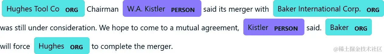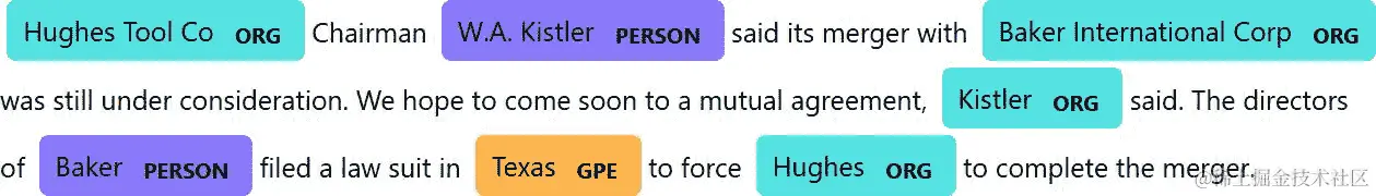 利用 spaCy 的漂亮的可视化模块 displacy,我们可以生成句子及其命名实体的视觉表示。这对检查结果非常有帮助: