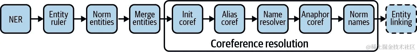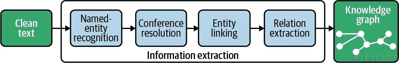 从文本中提取结构化信息需要几个典型步骤,如 Figure 12-2 所示。首先是命名实体识别,找到文本中的命名实体并标记其正确类型,例如,人物、组织或地点。同一实体通常会在文档中被不同变体的名称或代词多次引用。第二步是共指解析,识别和解决这些共指,以防止重复和信息丢失。