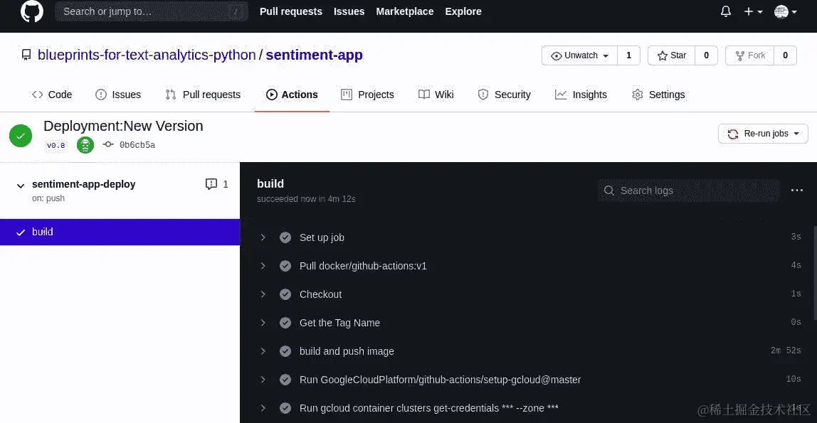 最后,我们使用最新的 Docker 镜像更新 Kubernetes 部署。这是我们使用TAG_NAME来标识我们在第二步推送的最新发布的地方。最后,我们添加一个操作来监视我们集群中滚动的状态: