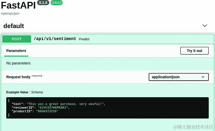 如果运行kubectl get service命令,它将提供运行的所有 Kubernetes 服务的列表,包括sentiment-app-loadbalancer。需要注意的参数是EXTERNAL-IP,它可以用于访问我们的 API。可以使用链接http://[EXTERNAL-IP]:5000/apidocs访问sentiment-app,该链接将提供 Swagger 文档,并且可以向http://[EXTERNAL-IP]:5000/api/v1/sentiment发出请求: