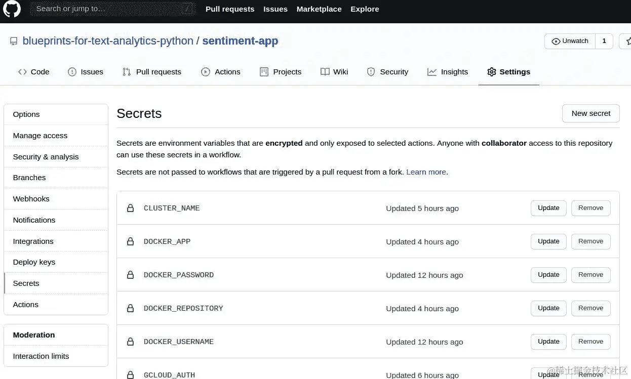 对于部署步骤,我们必须连接到正在运行的 GCP 集群并更新我们用于部署的映像。首先,我们必须将PROJECT_ID、LOCATION_NAME、CLUSTER_NAME和GCLOUD_AUTH添加到密码中以启用此操作。我们将这些编码为密码,以确保我们的云部署项目细节不会公开存储。您可以通过使用提供的说明来获取GCLOUD_AUTH,并将下载的密钥中的值添加为此字段的密码。