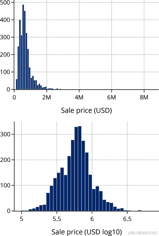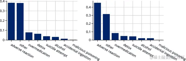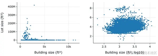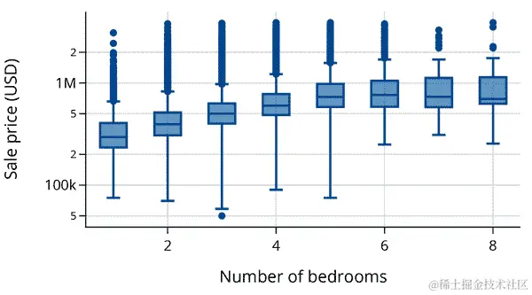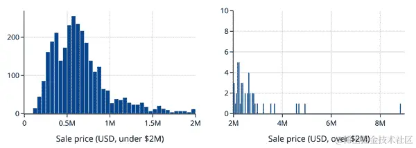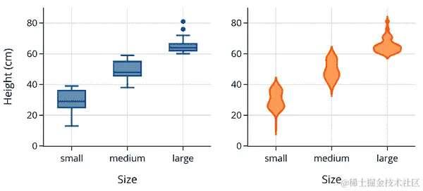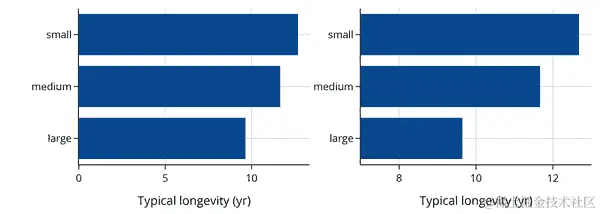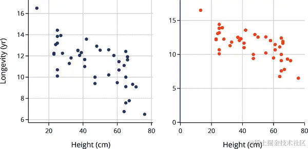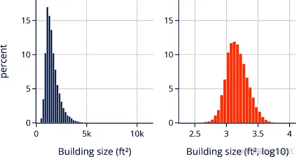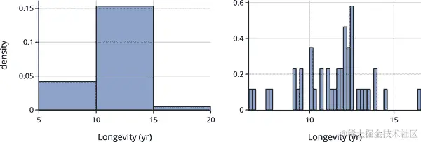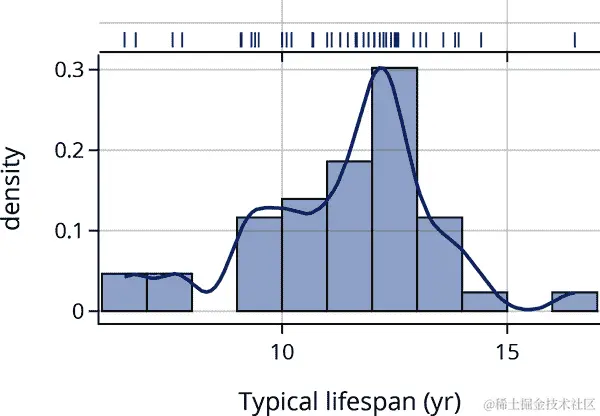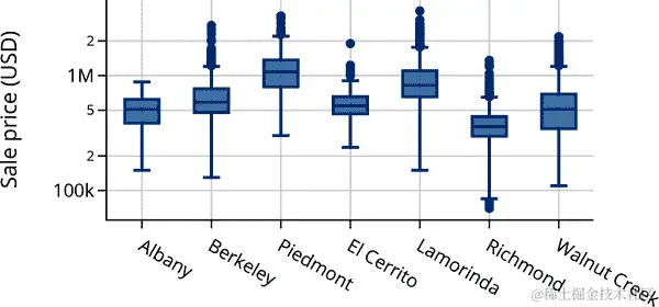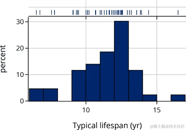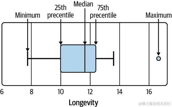 这两个分布都是右偏的,这在值有下限时经常发生(在这种情况下是 0)。比较这两个分布的更好方法是使用量化-量化图(见 第十章)。使用 q-q 图可以更容易地比较均值、扩展和尾部。