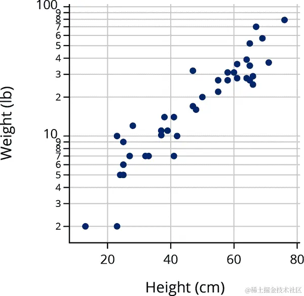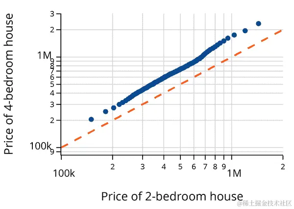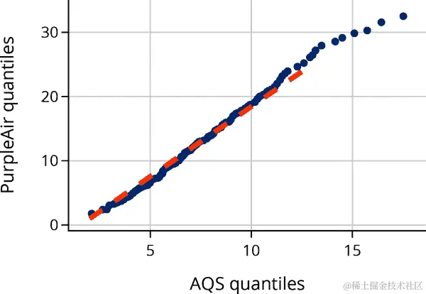 量化-量化图大致是线性的。我们叠加了一个斜率为 2.2 的虚线,它很好地对齐了分位数,这表明 PurpleAir 测量的分布约是 AQS 的两倍。