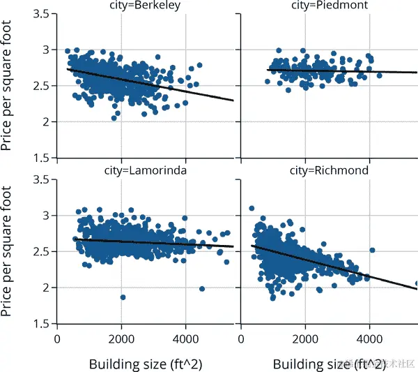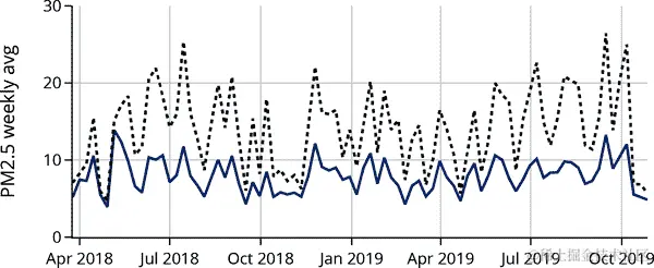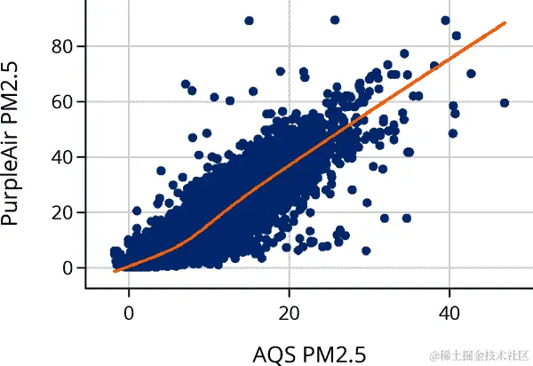 在开始这项分析之前,我们预期 PurpleAir 测量通常会高估 PM2.5。事实上,在散点图中反映了这一点,但我们也看到这两台仪器的测量之间似乎有强烈的线性关系,这将有助于校准 PurpleAir 传感器。