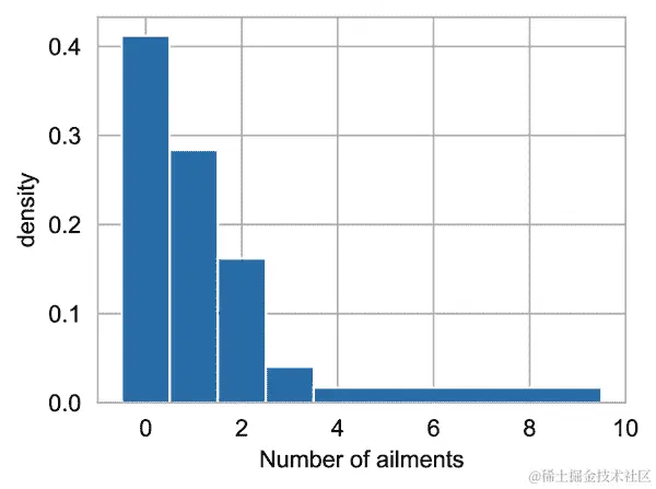ailments 和 children 都只接受几个整数值。children 的值为 3.0 或 ailments 的值为 9.0 代表什么意思?我们需要更多信息才能搞清楚。列名及其在数据框中的存储方式不足以解释。因此,我们需要查阅表 10-1 中显示的数据字典。