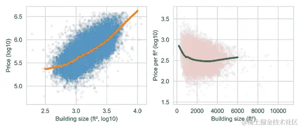 虽然关系看起来是线性的,但除了少数几个读数外,其余都集中在图的左下角。让我们重新制作散点图并放大数据的大部分,以便更好地观察。我们还向图中添加了一个平滑曲线,以帮助更好地看到关系: