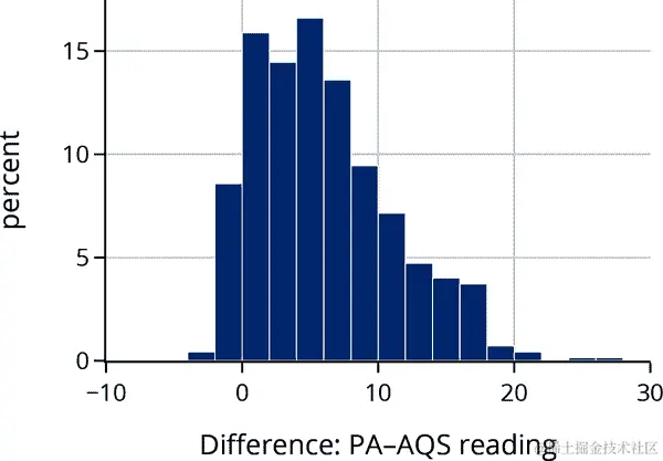 如果仪器完全一致,我们会在 0 处看到一个尖峰。如果仪器一致且没有偏差的测量误差,我们期望看到以 0 为中心的分布。然而,我们看到 90% 的时间,PurpleAir 测量大于 AQS 的 24 小时平均值,大约 25% 的时间高出 10 µg/m³,考虑到 AQS 的平均值通常在 5 µg/m³ 到 10 µg/m³ 之间,这是很多的。