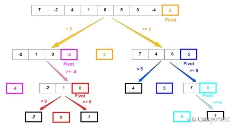 3.递归排序:递归地对枢轴左右两部分的子数组进行快速排序。