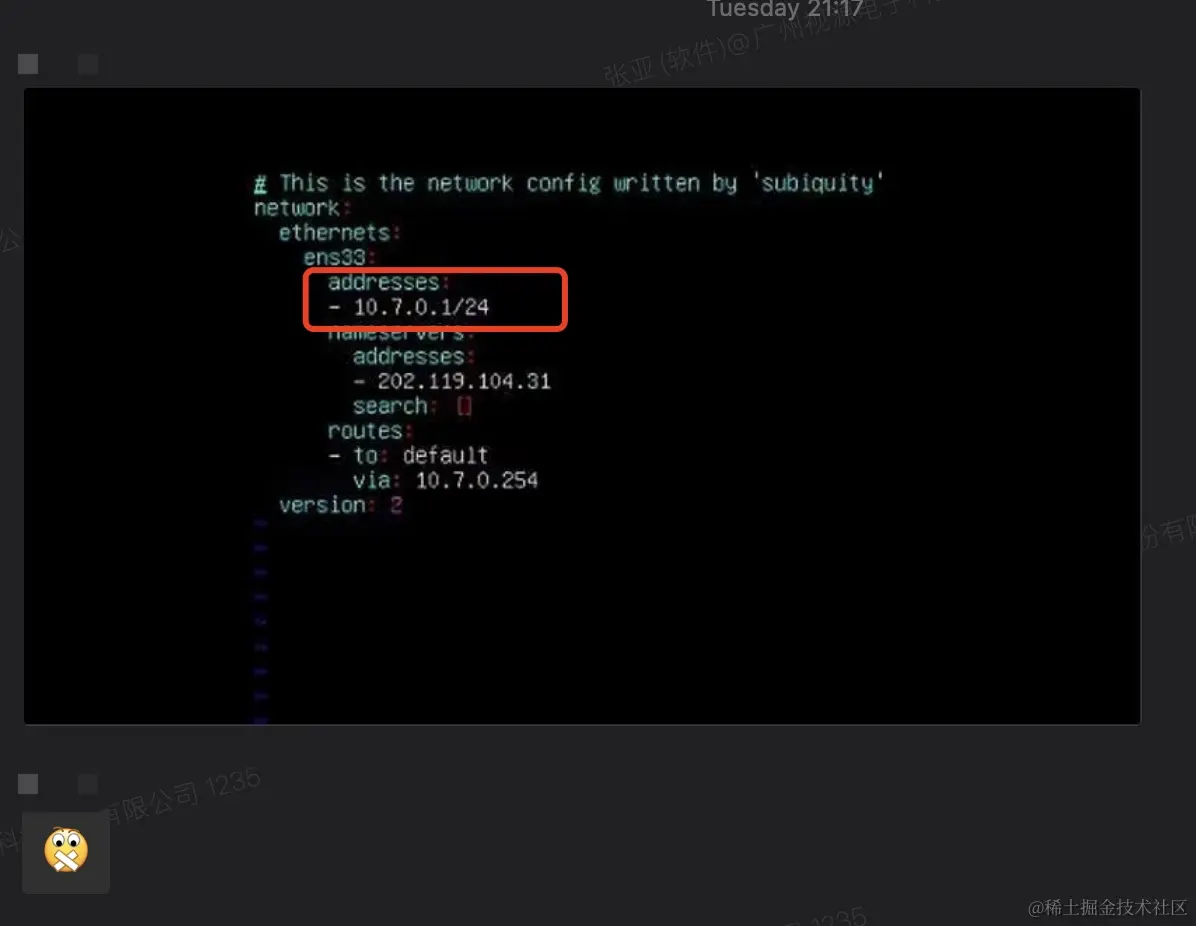 在「嫌疑人」的配合下, 我们确认了这台虚拟机的 IP 的确错误地配置成了 10.7.0.1, 导致了 IP 冲突。