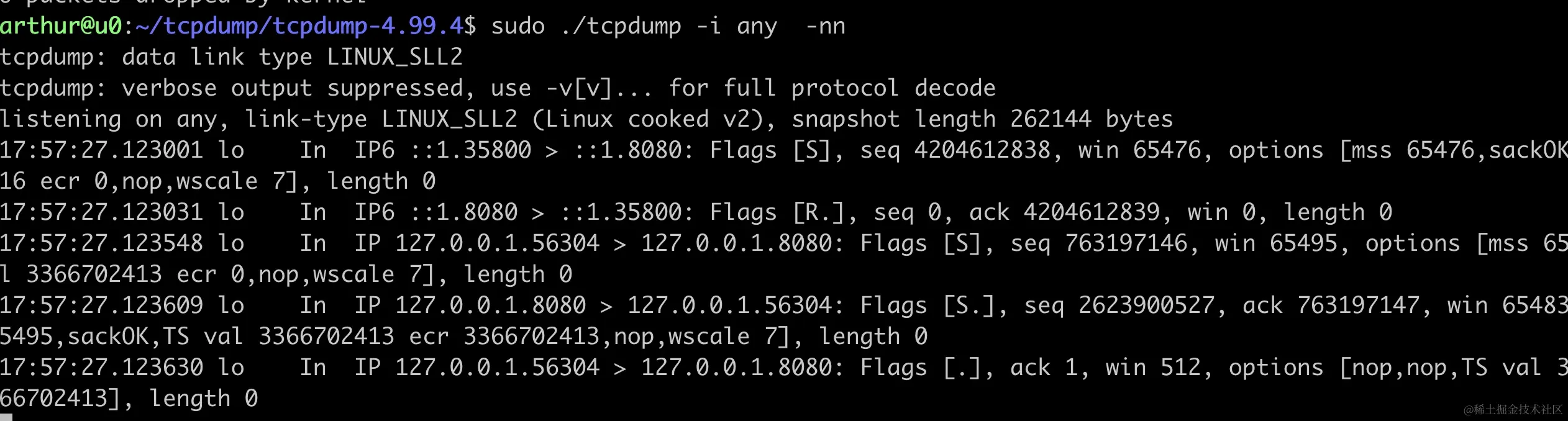 此时运行 tcpdump 就可以执行抓包了。
