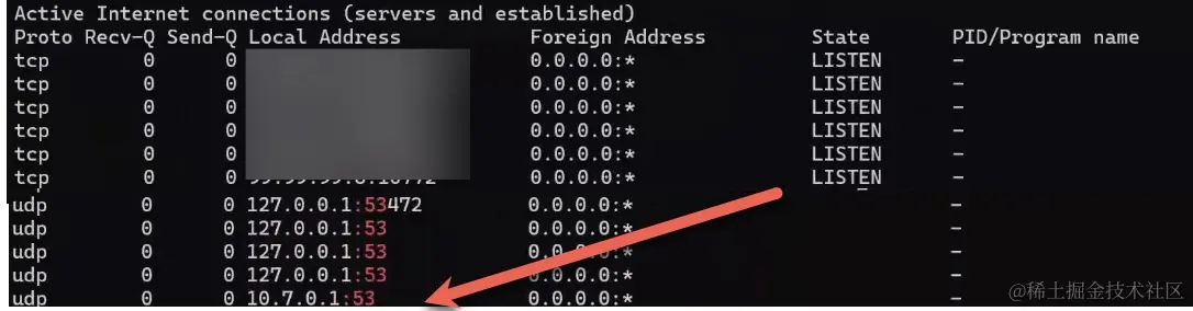 起初我们怀疑是 DNS 服务本身出了问题。但检查发现 10.7.0.1 上 53 端口处于正常监听状态: