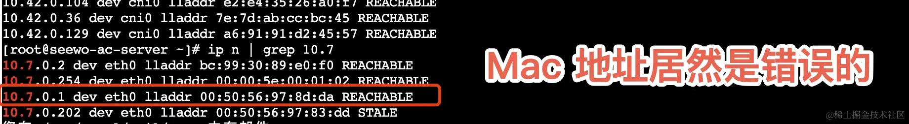 发现业务机上 10.7.0.1 对应的 mac 地址居然是错误的,而且状态还是 REACHABLE ,这意味着 10.7.0.46 确实是与局域网中的某一台 10.7.0.1 的主机在通信。