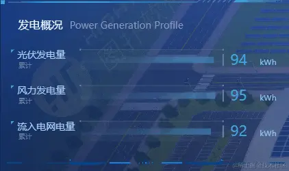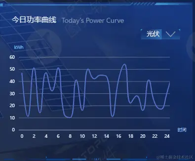 直观展示当日累计的光伏、风机、入网电量;运用曲线图形式展示功率随时间变化的波动曲线,支持切换风电、光伏、储能三种类型。