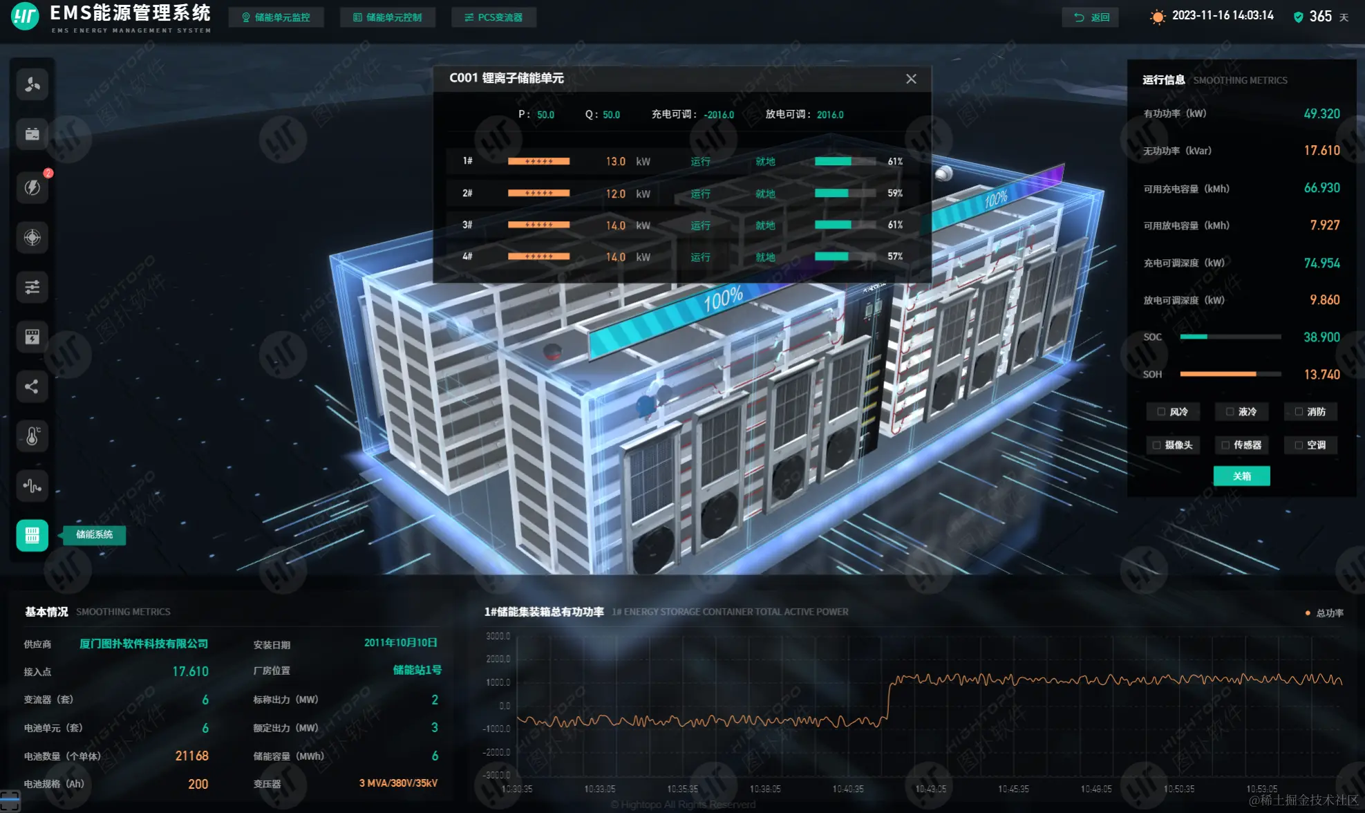 点击三维中的储能集装箱,可下钻至室内场景,储能界面展现了功率历史波动曲线、储能系统实时运行数据、各设备运行状态等。