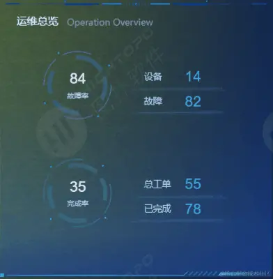 接入全厂设备管理系统、工单系统的汇总数据,实时展示在线设备数、故障设备数、总工单数、已完成工单数。