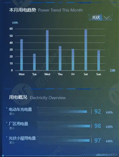 使用棒图的形式展示园区本月用电趋势,横坐标为日期,纵坐标为用电量;使用条形图的形式展示厂区、充电桩等的当日累计用电量。