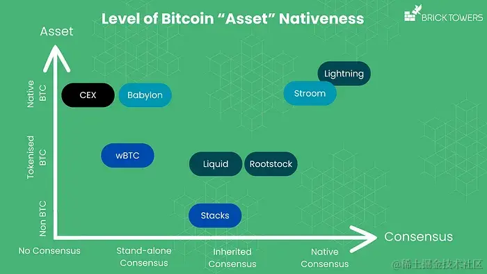 比特币收益产品越接近比特币的本地共识,它与比特币的对齐程度越高,通常被认为信任最小化的程度也越高。然而,在独立共识和继承共识类别中存在细微差别,这些类别中基础设施的去中心化程度和安全性各不相同。