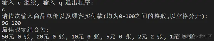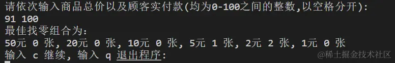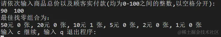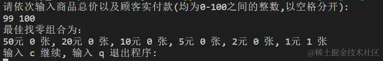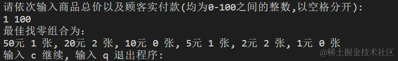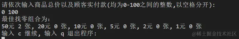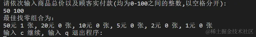 对“找零钱最佳组合”程序进行全面测试,确保程序能够正确处理各种付款金额,给出找零钱的最佳组合,找零张数最少。