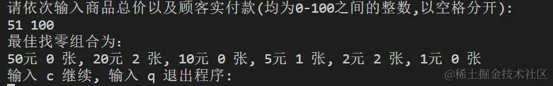 程序的各项功能,包括输入商品价格、付款金额、输出最佳组合方案、输出货币张数等。