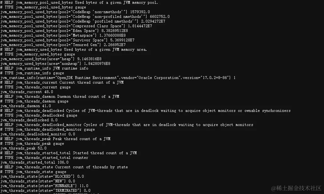 部署成功之后,可以访问容器中JMX Exporter端口的服务,就可以看到采集的JVM指标数据了。
