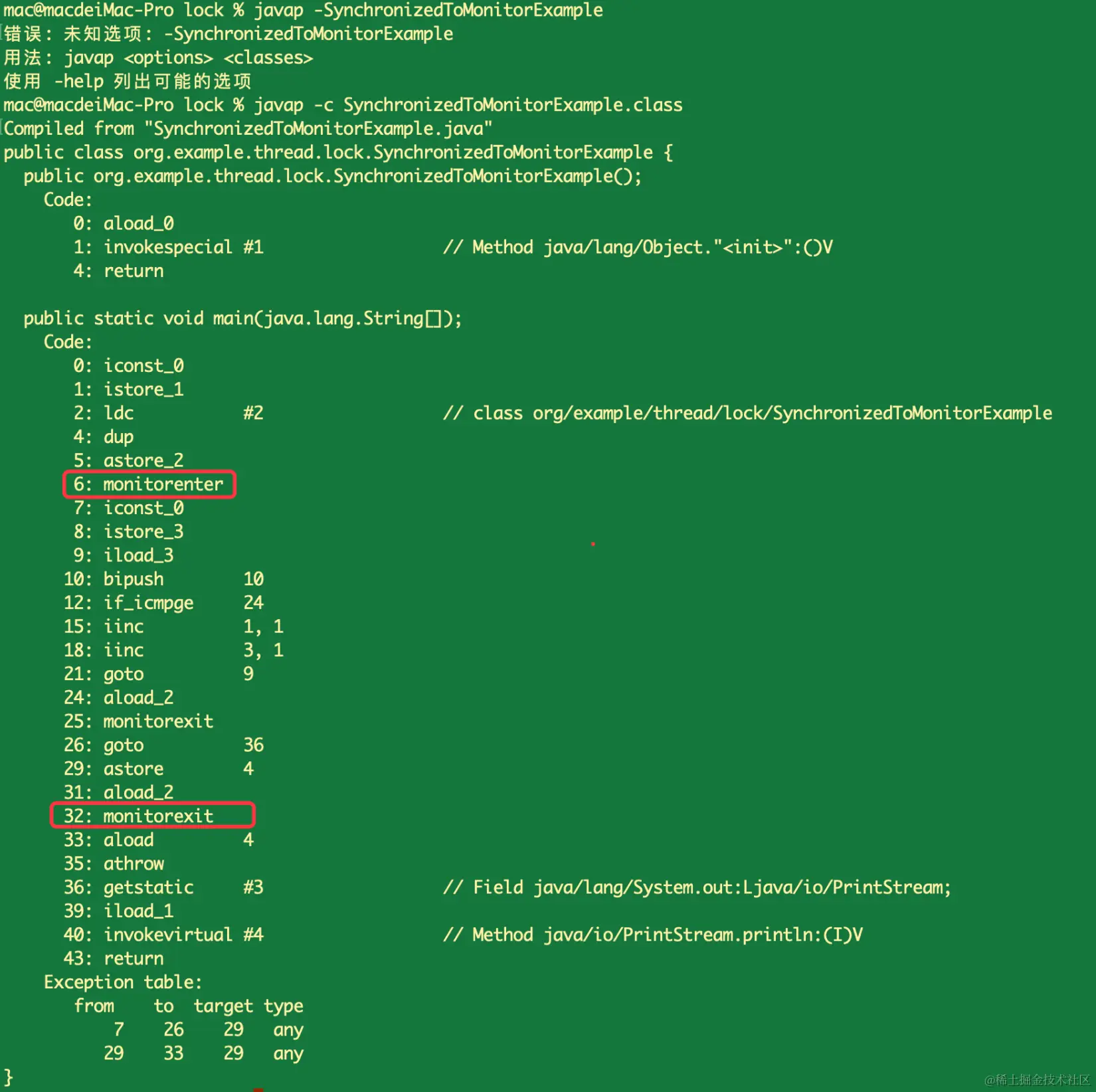 从上述结果我们可以看出,在 main 方法中多了一对 monitorenter 和 monitorexit 的指令,它们的含义是: