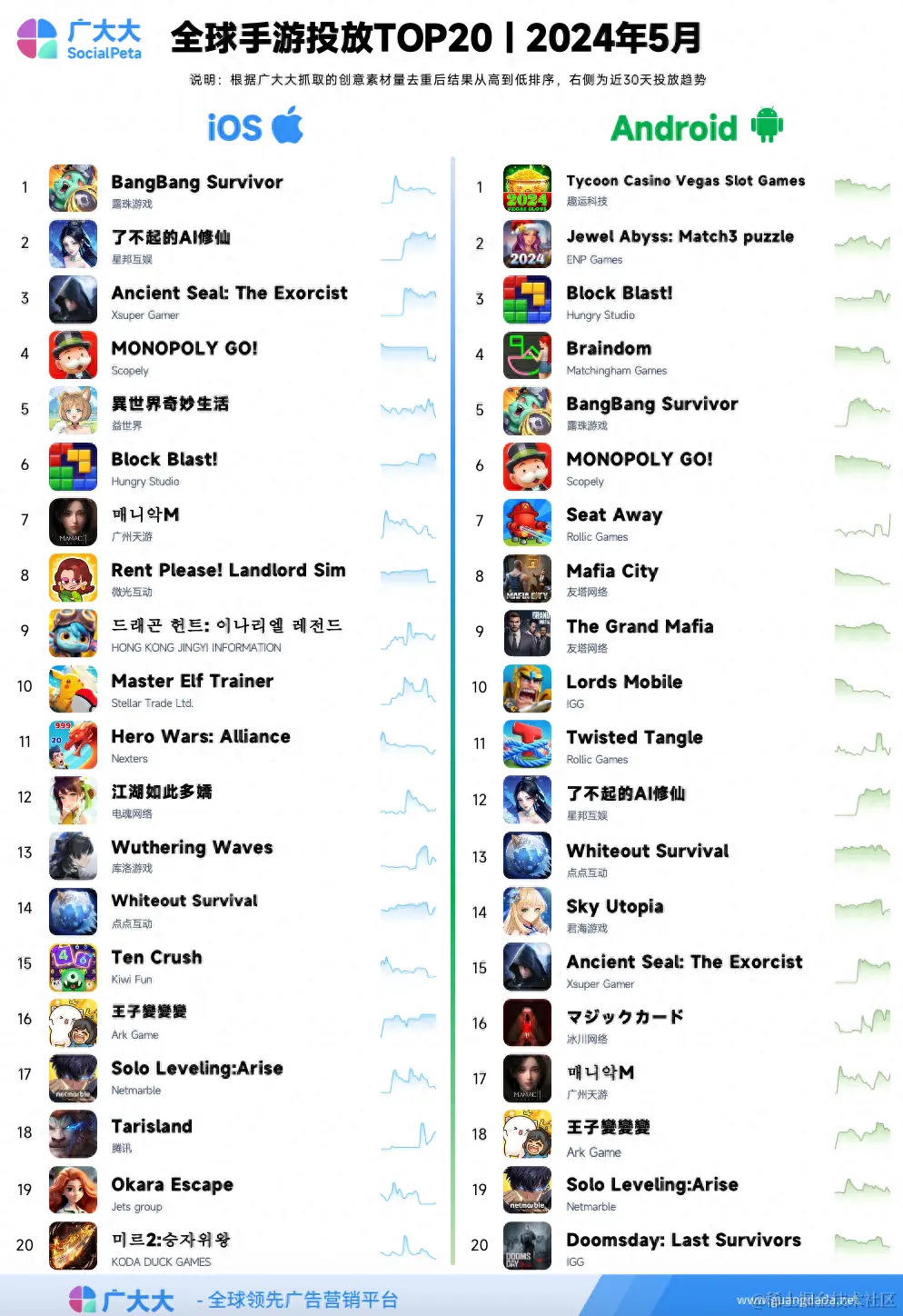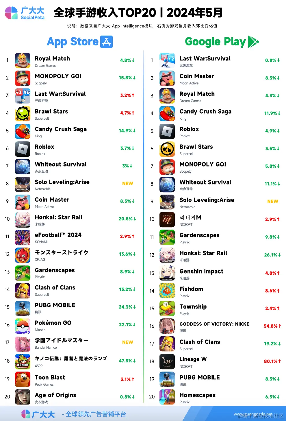 广大大发布2024年5月全球成功手游投放、收入和下载TOP20榜单,帮助更多移动应用从业人员了解全球移动市场变化趋势。