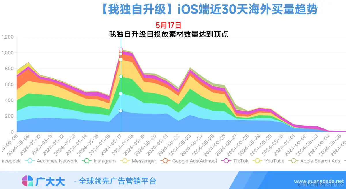 根据广大大-广告主分析功能 ,【Solo Leveling:Arise】5月累计去重投放预约素材接近1万条,累计投放素材85天,其中iOS端具体投放情况如下:
