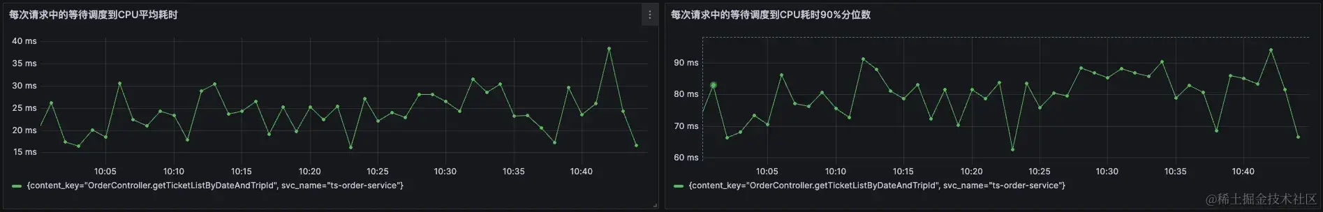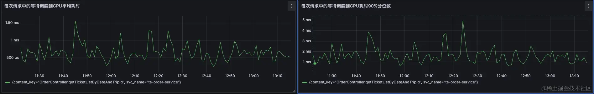 在云观秋毫的Demo环境中,通过北极星因果指标巡检,发现order-service的CPU调度耗时较长,其90分位线经常超过80ms,甚至达到90ms左右。此时指标已经说明了order-service的CPU资源不充分。