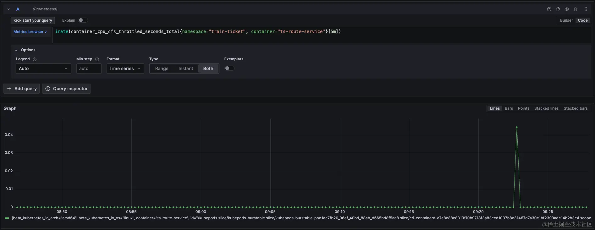 根据POD规格调整原则一,先去查看容器的CPU节流指标,发现其节流时间确实很大,说明POD的规格Limit设置过小了。