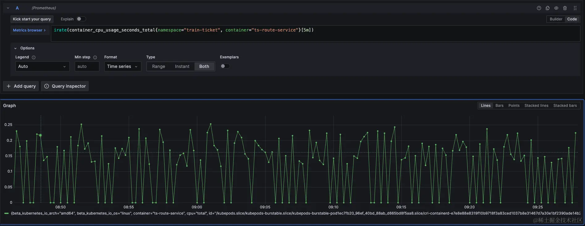 通过查询route-service的CPU节流(throttling)指标,发现其CPU节流时间很少,几乎没有波动。这与route-service北极星因果指标中每次请求都有10ms左右情况不符合,说明北极星因果指标中的CPU调度耗时并不是由于CPU节流导致的,也就意味着提高POD limit无法解决问题。