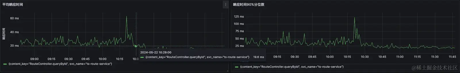 此时我们再去查看rout-service的相应延时,发现延时也有了显著的优化:可以看到平均延时在重新调度之前延时是普遍大于20ms的,而调整之后rout-service的延时已经没有高于20ms的了。