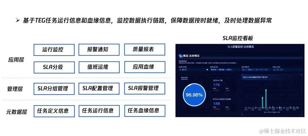 在指标时效性方面,我们基于任务的运行信息和血缘信息,监控整个数据的执行链路,保障数据按时就绪,及时处理数据异常。我们做了一套 SLA 监控工具。