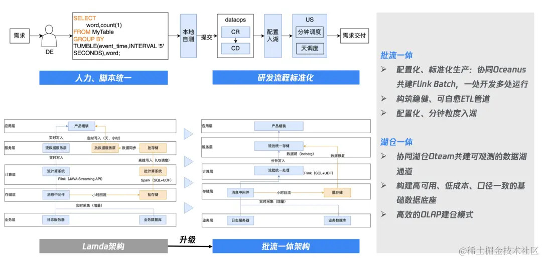 首先介绍湖仓一体的背景。基于之前 Lamda 的模式,离线和实时有两套架构,因此存在开发效率和质量的问题,也是因为离线和实时不同的链路,导致了数据的不一致和数据波动、延迟等。同时两套链路也会带来人效问题,离线和实时两套代码、两套脚本,需要研发人员分别去开发。