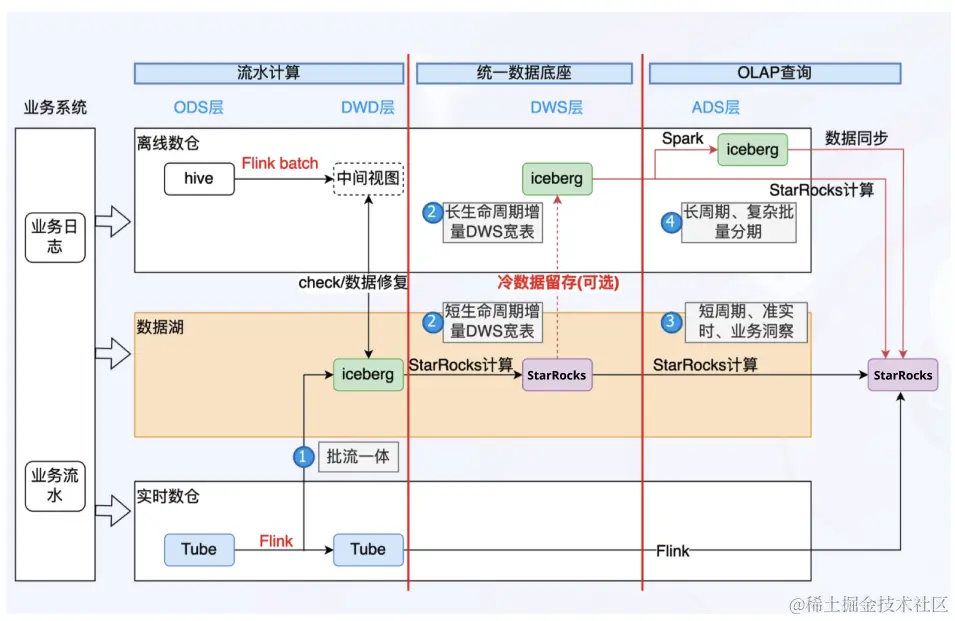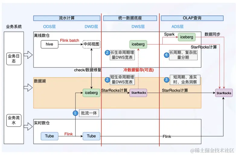 在实时数据部分,它支持实时数据接入,支持事务,可以提升数据可见性。因此我们引入了 StarRocks 作为整个湖仓 2.0 迭代的基础。同时我们做到了冷热数据的隔离,特别是在 StarRocks 往 Iceberg 同步时,实现了数据降冷的方式。通过包装 StarRocks 的一个 export 任务,实现了一套降冷的能力。把 StarRocks 的数据加工计算好,直接往 Iceberg 同步,实现了整个流批数据的一致,以及整个计算和开发效率的提升。在热数据部分,通过直接接入实时数据流,然后引入到StarRocks,实现数据的热加载。