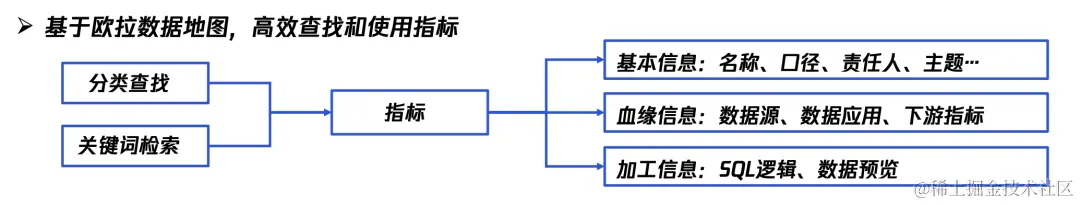 在指标易用性上,我们通过统一管理的指标元数据信息,提供了一套查找和使用数据的数据地图。基于数据地图可以根据一些关键词、标签、主题,高效地查找和使用指标。用户可以通过分类查找和关键词检索,来查看这些指标的基本信息、血缘信息和指标加工信息等。
