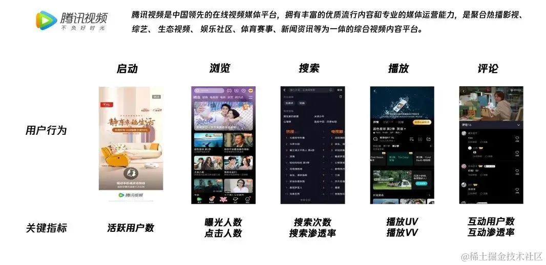 用户在腾讯视频的行为,被我们抽象为一些关键指标。用户通过启动视频 APP,浏览页面里的海报,点击或者搜索视频,观看视频内容,观看结束后对视频做一些评论。会产生活跃用户数,海报的曝光数、点击数、搜索的次数、播放次数、互动指标等各种各样的关键指标。这些指标是腾讯视频业务运营的基础,可以帮助业务进行决策,所以管理和治理好这些指标至关重要。