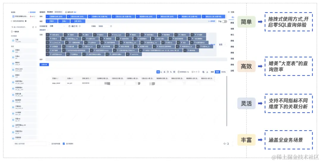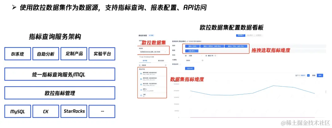 在指标一致性方面,提供统一的指标服务,统一管理指标。并且打通了这些指标对应的数据源配置,包括 MySQL、ClickHouse、StarRocks 等相关的查询存储引擎,把指标的口径和指标的基础元数据信息以及业务元数据信息统一地管理起来,提供统一的指标查询服务。同时还有一套查询语言,可以屏蔽底层存储计算引擎的差异,提供统一的服务支持下游的应用。如上图右侧所示,可以在看板中选择相应的数据集以及指标维度进行查询,也可以通过一套类 SQL 的 MQL 语言,查询指标和维度信息。