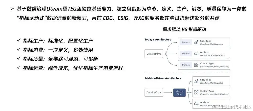 我们未来会建立以指标为中心,定义、生产、消费、质量保障为一体的指标驱动式数据消费的新模式。在指标生产部分,提供标准化配置化的生产。指标消费部分提供一次定义,多处使用。指标质量部分提供全链路全面的可观测和诊断。指标运营部分降低成本,优化指标生产消费的流程,最终形成以指标驱动的数据消费新模式。