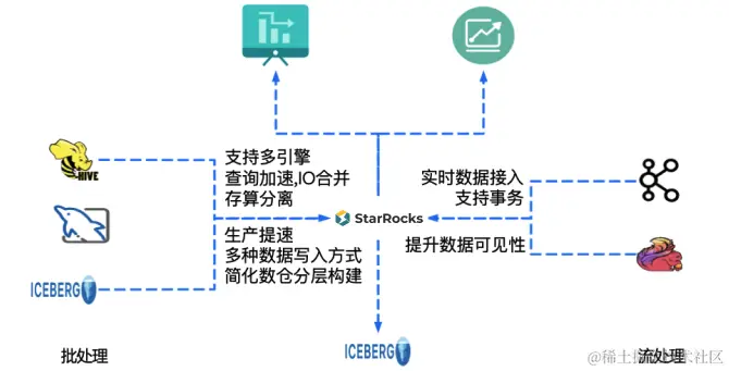 我们引入 StarRocks,主要在于 StarRocks 在复杂查询、高并发和实时分析等 OLAP 场景下能够提升分析效率。在批处理部分,它通过支持多引擎的查询加速、I/O 合并、存算分离等,能够更好地支持我们现有的技术栈,同时也支持生产提速,简化了整个数仓的分层架构。